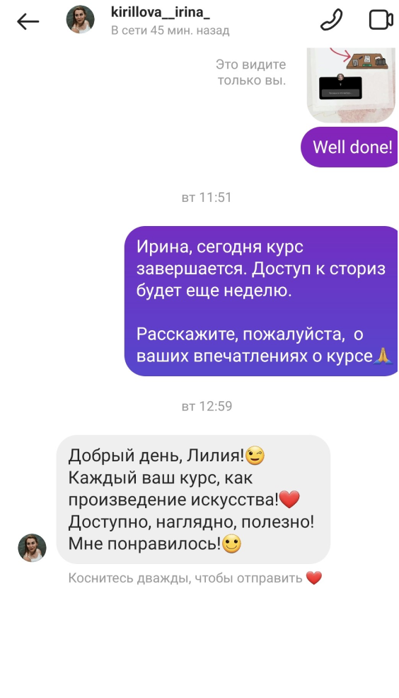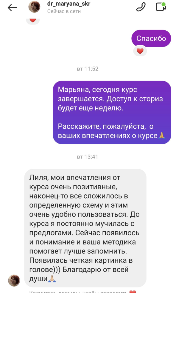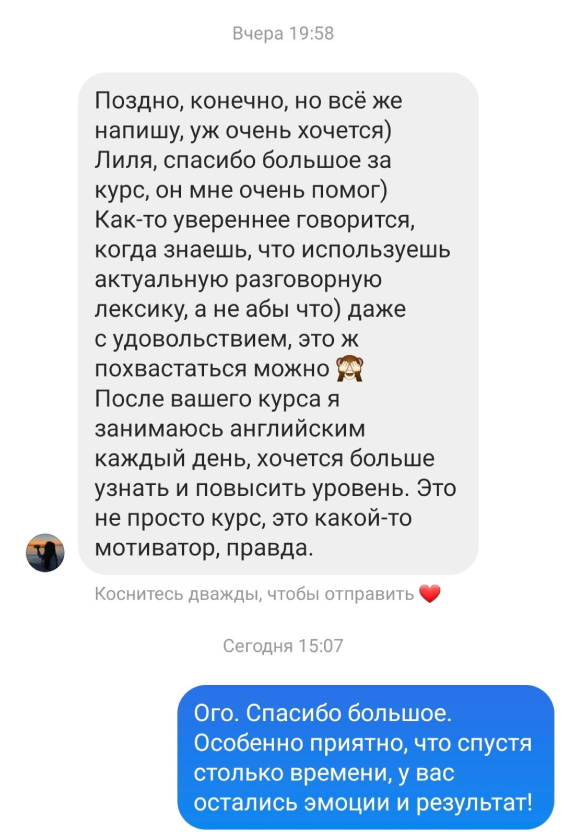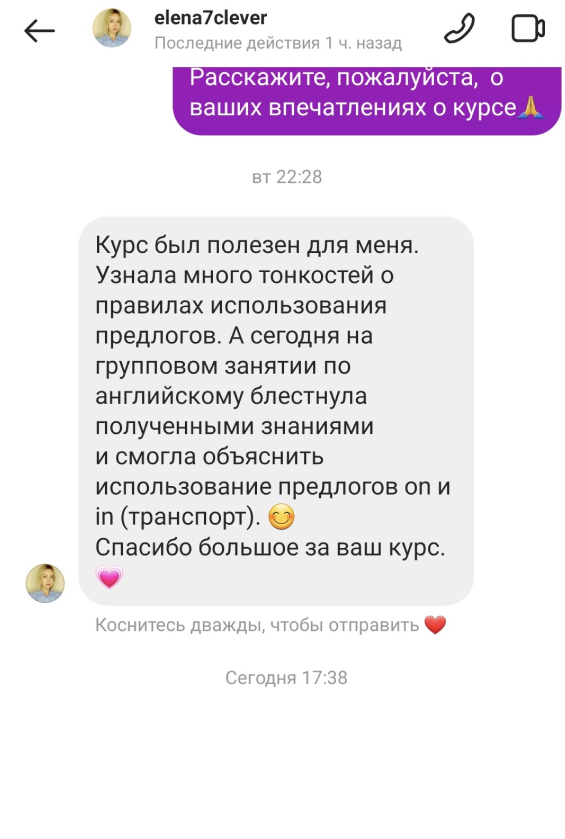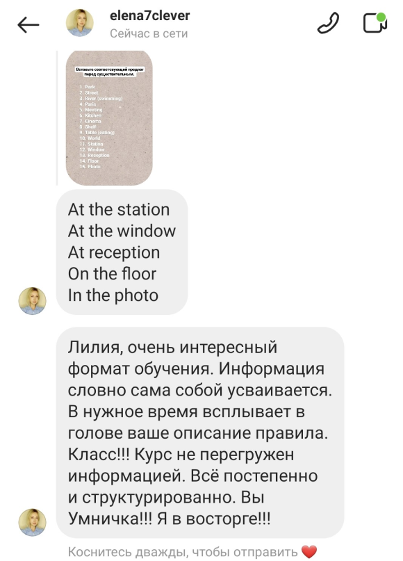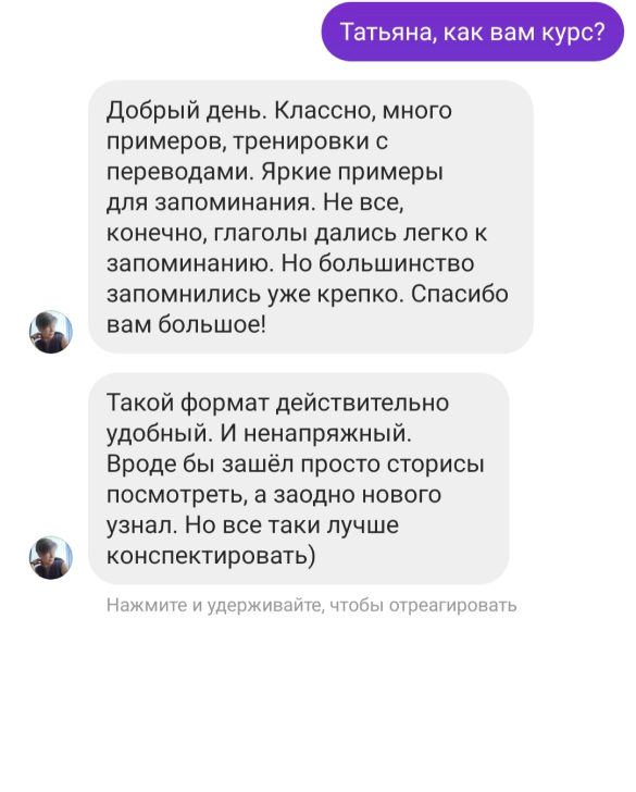 Обратная связь на ваши творческие задания, аудио, коррекция ошибок, рекомендации преподавателя, общение в личных сообщениях.