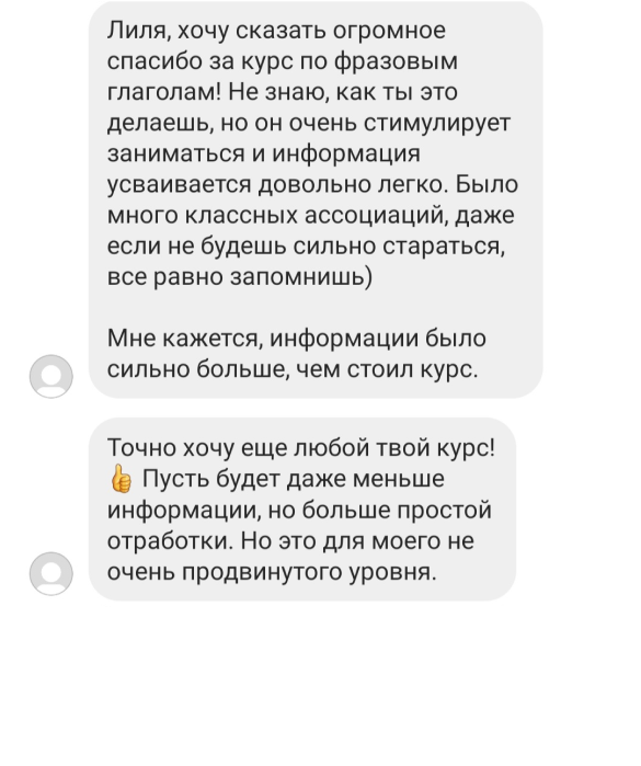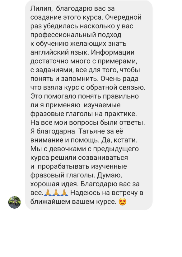 Пособие в формате pdf с дополнительными примерами, конспектом курса, дополнительными упражнениями, заданиями с ключами, которые вы получаете навсегда. Для тех, кто хочет дополнительно тренировать фразовые глаголы из курса и упрочить свой результат.