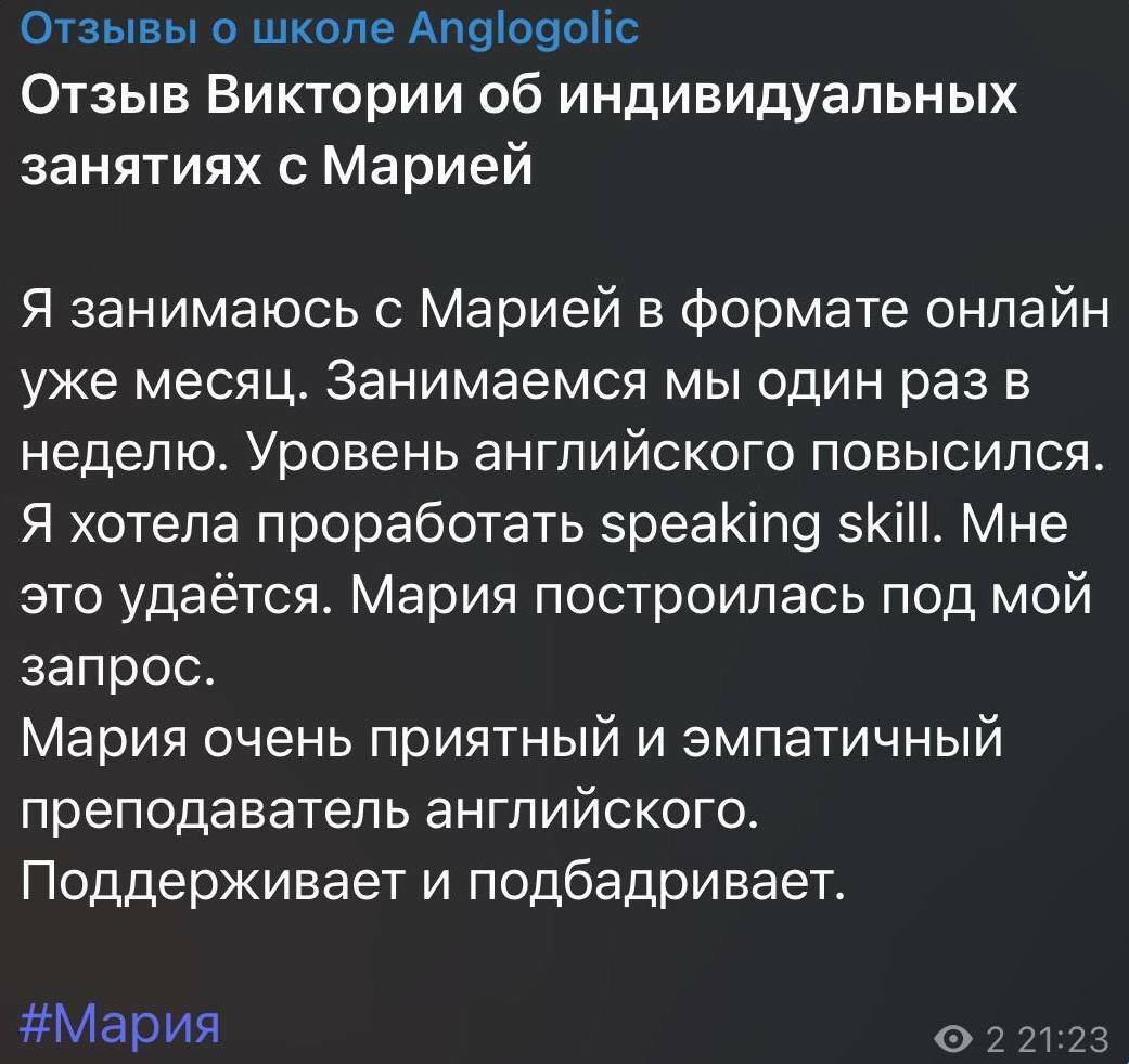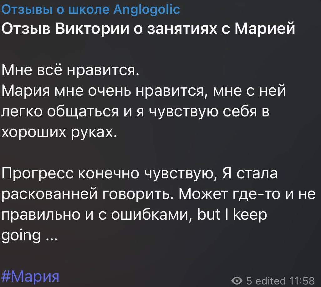 Мария преподает в нашей школе с декабря 2023 года. И мы уже видим крутые результаты ее работы и отзывы довольных студентов.