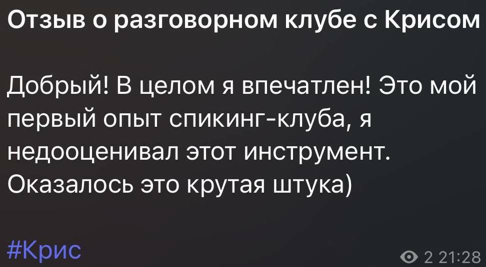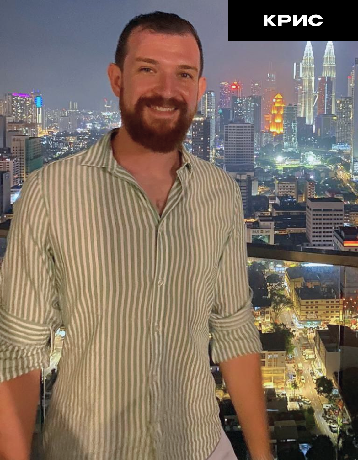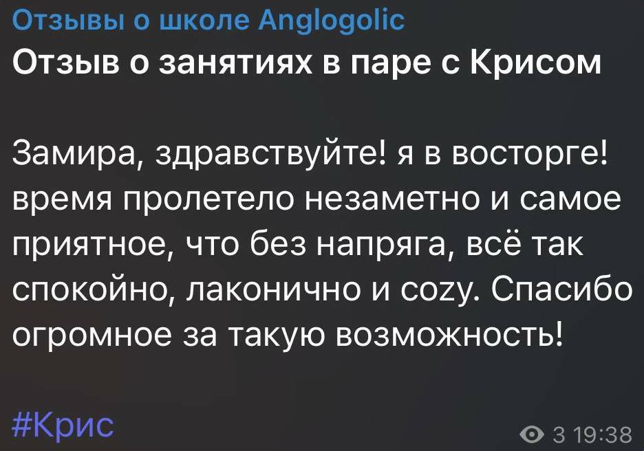 Chris - носитель языка, родом из Великобритании с прекрасным и понятным английским (что не часто встречается), он внимателен ко всем ученикам, тактичен и очень бережно ведет разговорные клубы. Поэтому многие его ученики пишут «очень комфортно» об уроках с Крисом.