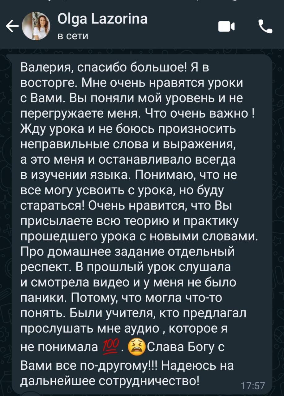 «Мне важно, чтобы студент говорил на языке во время занятий, начиная с первого урока, поэтому я использую современные и аутентичные пособия. В ходе наших занятий, студент перестаёт переводить дословно свои мысли с русского на английский и начинает думать на английском»